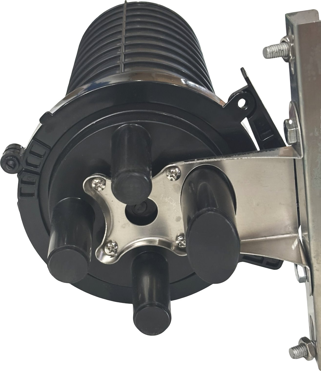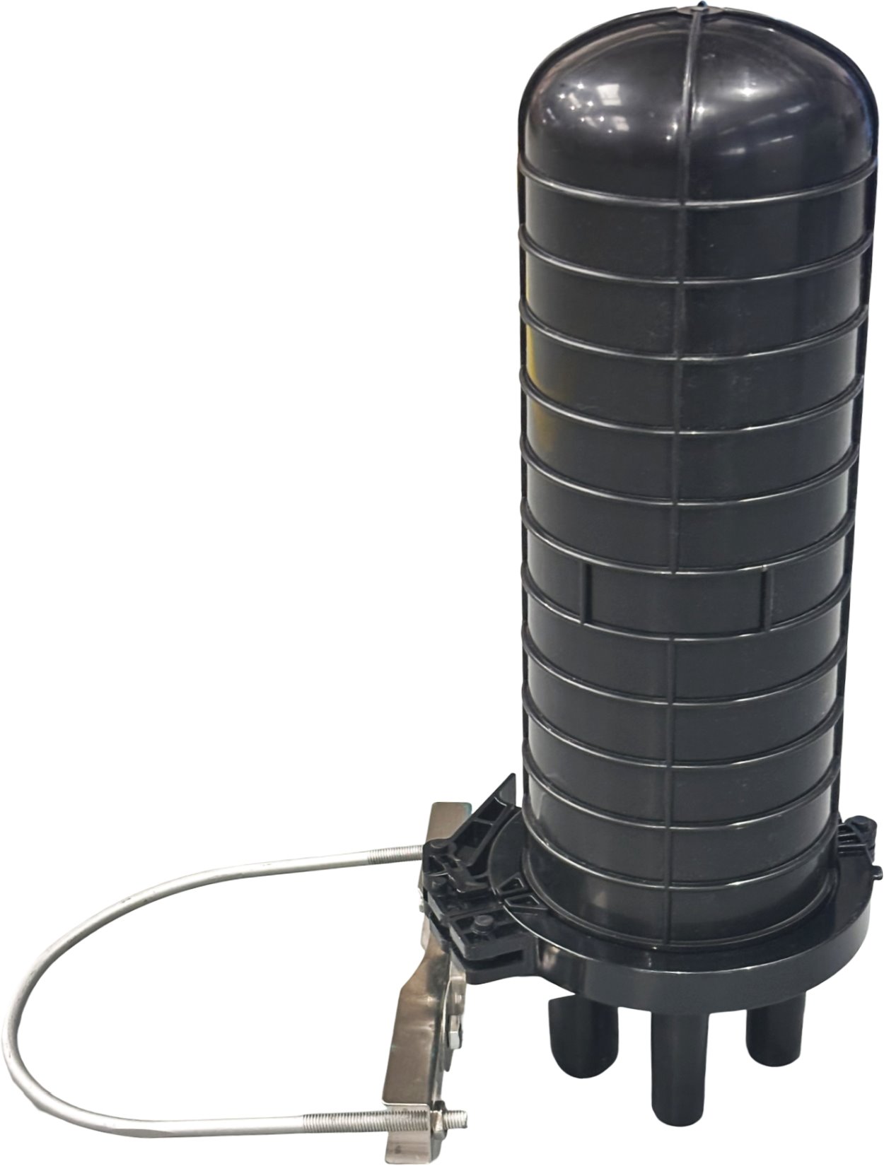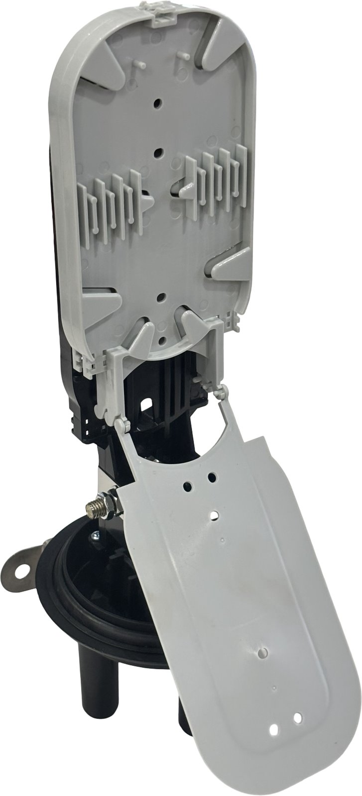 The optical underground splice with a capacity for up to 48 optical connections is designed for installation underground or on a pole. It includes 2 built-in cassettes, each accommodating 24 optical splices in two rows. With an IP68 rating, the splice is fully resistant to dust and water, ensuring a long lifespan even in harsh conditions. The splice is made from black ABS material, and its compact dimensions of 125 x 125 x 425 mm facilitate installation and handling.