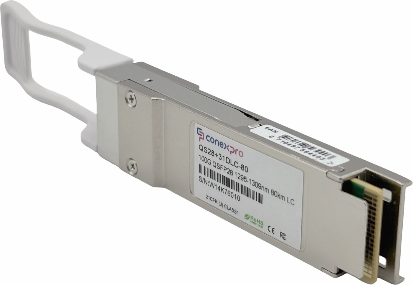 100 Gigabit Singlemode QSFP28 CWDM module from the manufacturer Conexpro designed for backbone connections with wavelengths (Tx and Rx) 1295 nm, 1300 nm, 1304 nm, 1309 nm, speed of 100 Gbps is equipped with 2x LC connectors and is intended for connections over distances up to 80 km. This module offers universal compatibility, meaning it can work with almost all available active components. Naturally, it supports optical connection diagnostics using the DDM (Digital Diagnostic Monitoring) feature.