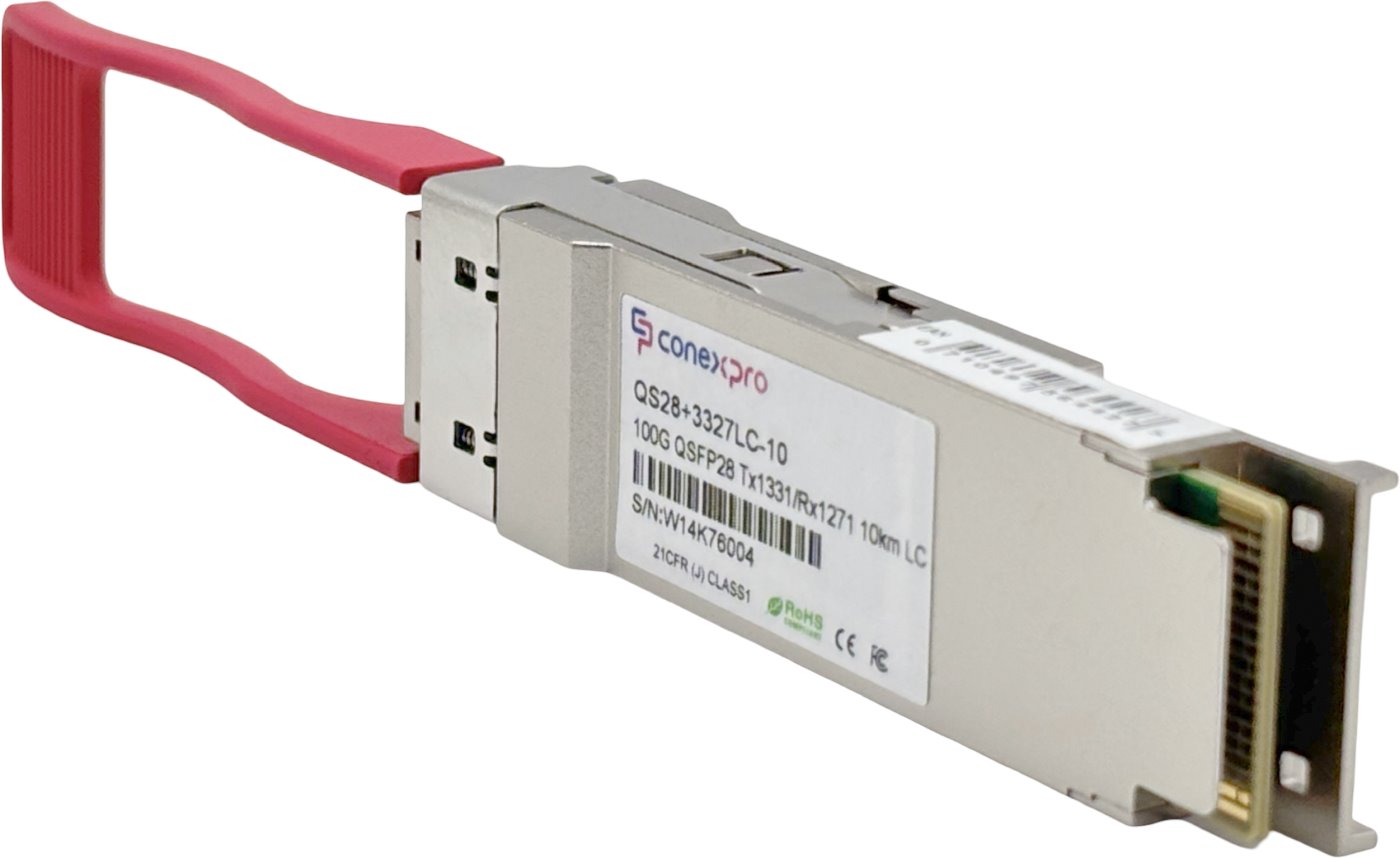 100 Gigabit Singlemode QSFP28 CWDM module from the manufacturer Conexpro designed for backbone connections with wavelengths (Tx and Rx) 1295 nm, 1300 nm, 1304 nm, 1309 nm , speed of 100 Gbps is equipped with