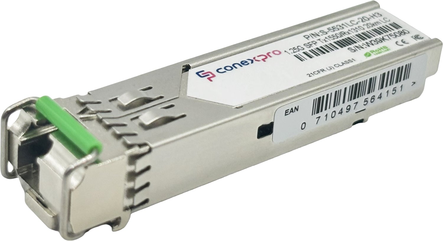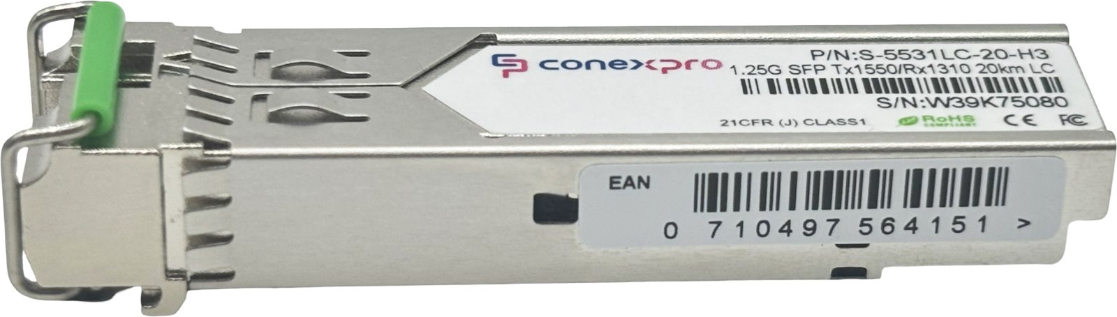 Gigabit WDM/Bidi Singlemode SFP module from the manufacturer Conexpro with a wavelength (Tx/Rx) of 1550/1310 nm, speed of 1 Gbps, equipped with one LC connector with UPC polishing and designed for connection at a distance of 20 km. The module is specifically modified to ensure wide compatibility, including full support for devices HP / H3C / 3Com and other brands according to MSA standards. Of course, it supports optical link diagnostics using the DDM (Digital Diagnostic Monitoring) function.
