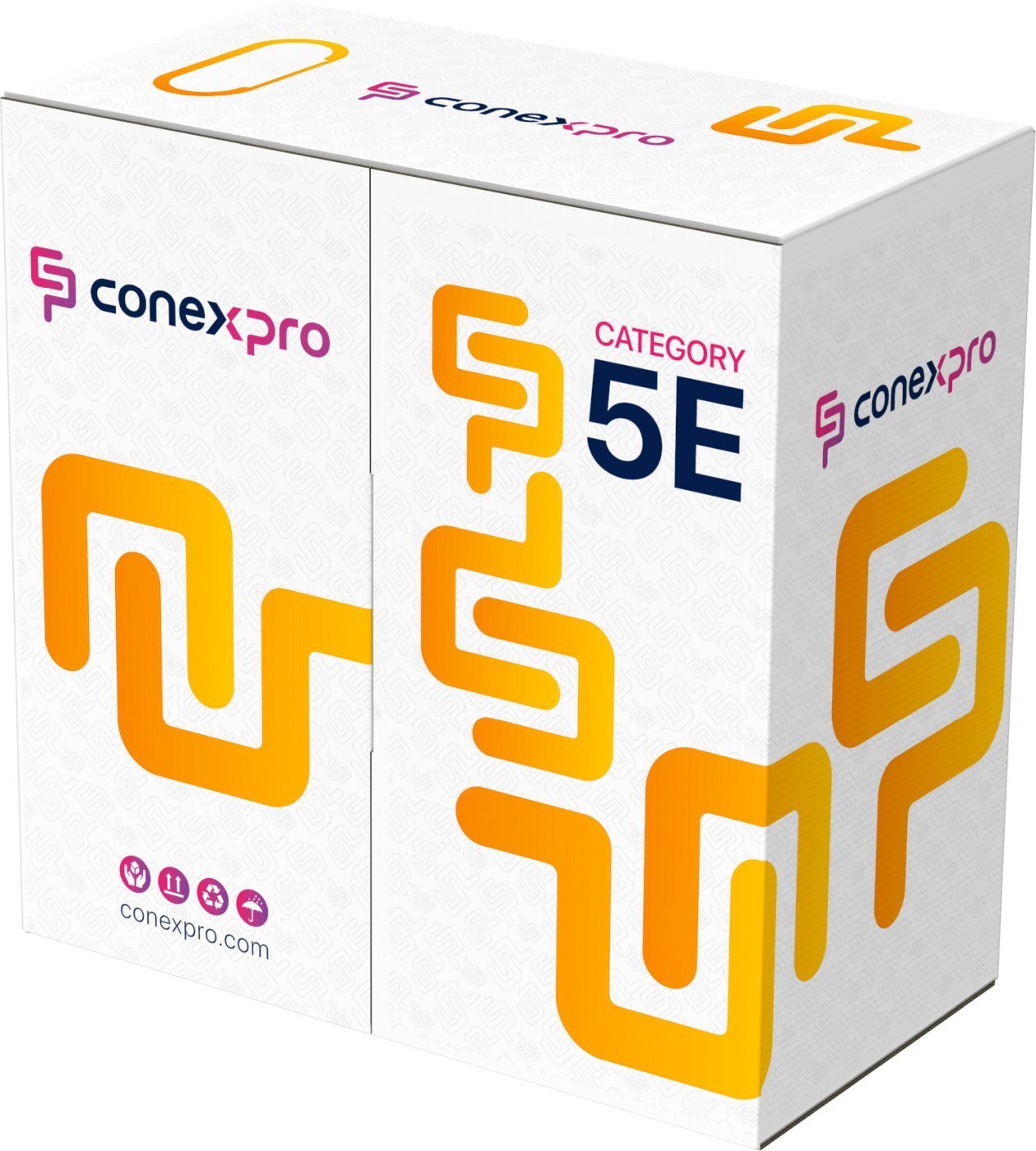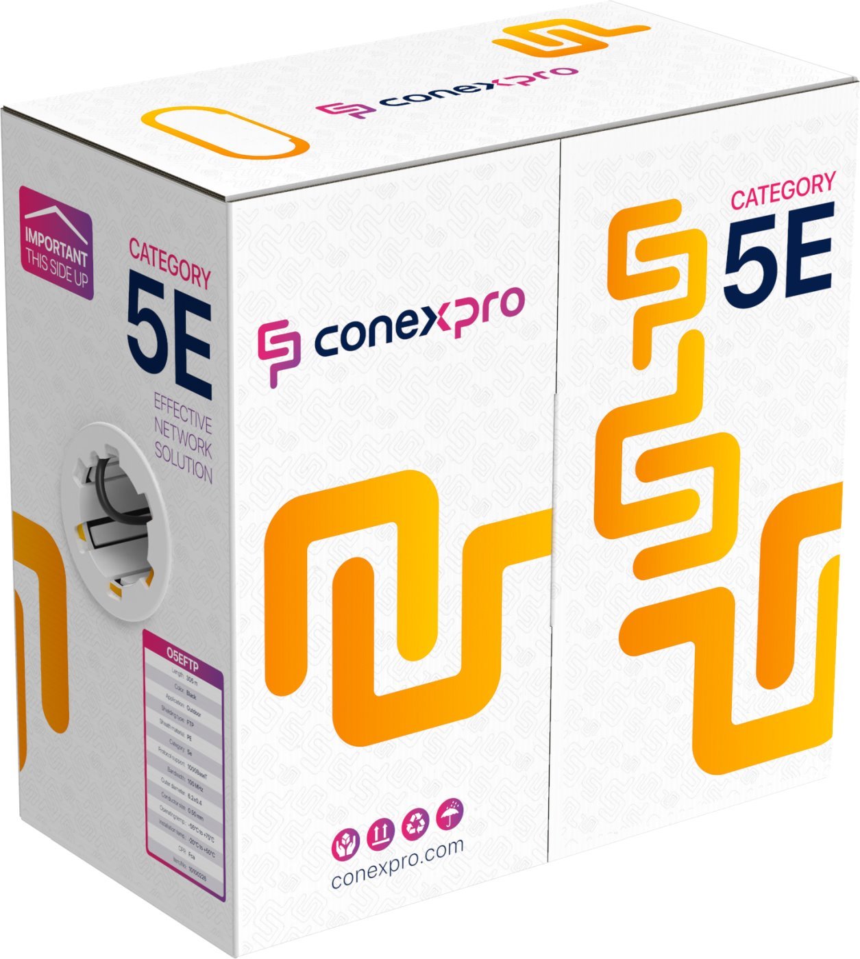 The Conexpro category 5e FTP cable is designed for outdoor installations of structured cabling and easily meets international standards including all current amendments. The cable allows data transfer speeds of up to 1 Gbps (1000 Base-T). The sheath is black, made of PE material, with shielding and a grounding wire for attachment to a connector with a ring. The conductors are made of high-quality copper wire with an AWG24 cross-section. The cable is packaged in a high-quality cardboard box with a modern design and is marked every meter from 0 to 305 m.