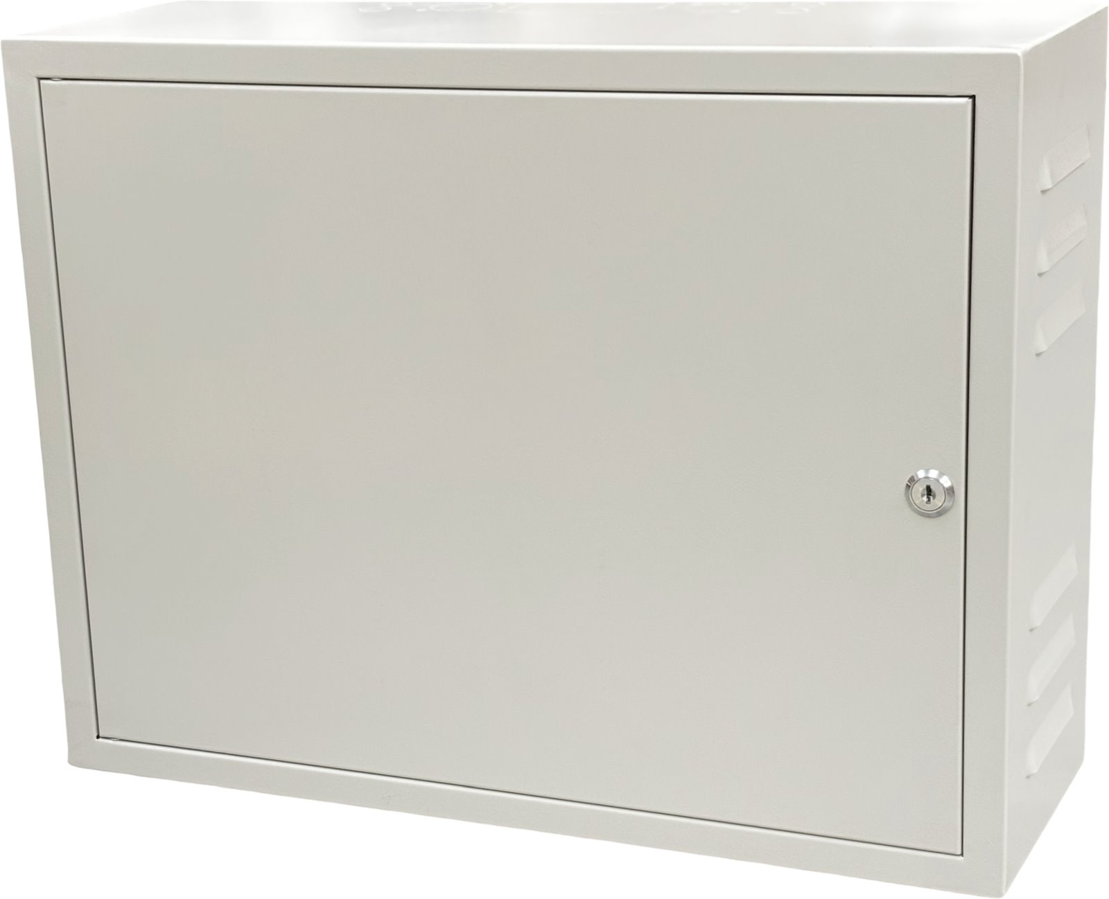 A lockable mounting cabinet with dimensions of 500 x 500 x 200 mm (W x H x D) featuring ventilation openings on both the left and right sides, primarily designed for housing television, satellite, or network