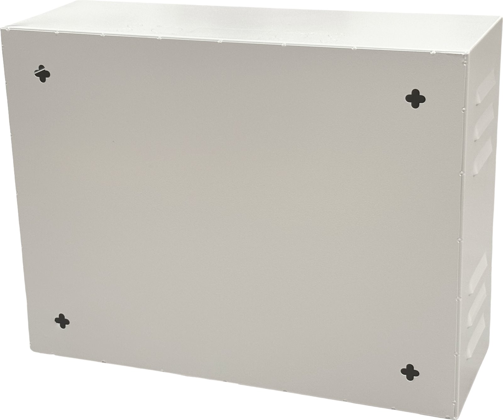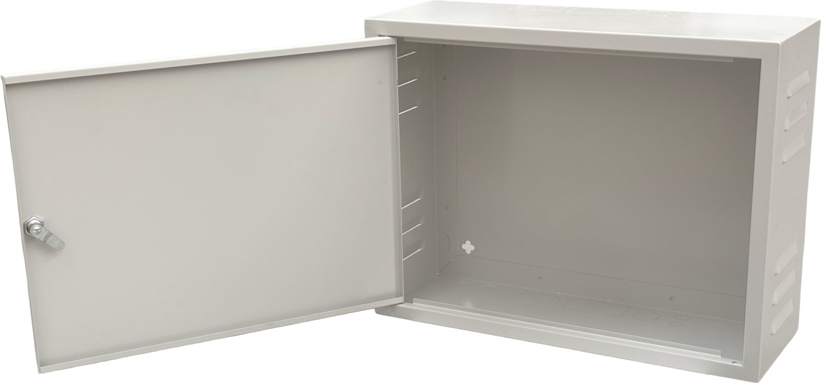 The cabinet is made of galvanized material resistant to rust, with a glossy light gray color finish. By removing the breakable covers, access to openings for cable routing on both the top and bottom sides can be obtained. Wall mounting is facilitated by 4 mounting holes on the back of the cabinet. The cabinet can be installed to open the doors either to the left or right side.
