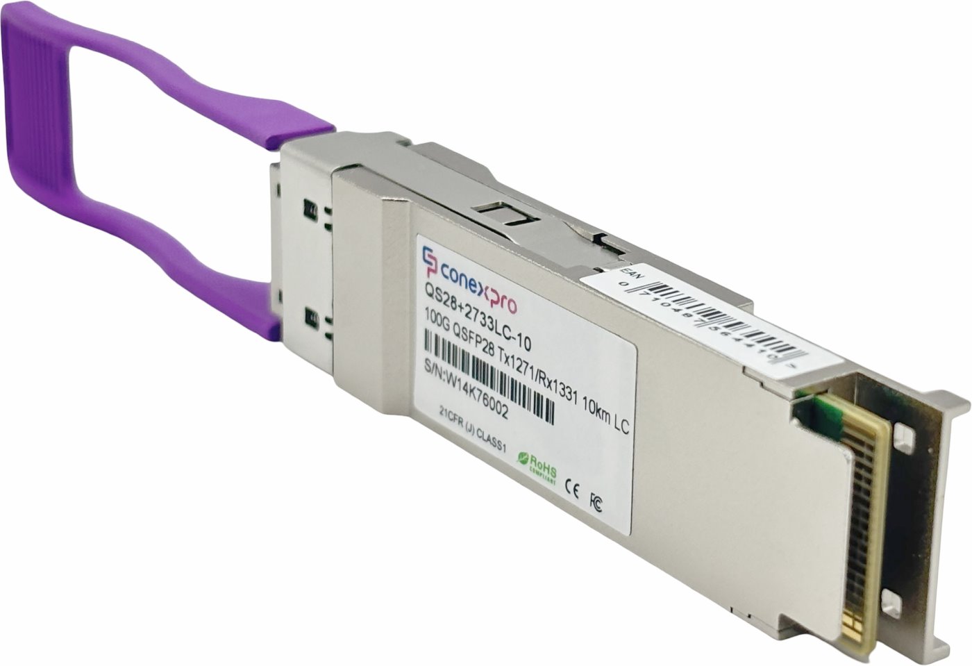 100-Gigabit WDM/Bidi Singlemode QSFP28 module from manufacturer Conexpro with wavelengths (Tx/Rx) 1271/1331 nm, speed of 100 Gbps, equipped with one LC connector with UPC polish and designed for connection over a distance of 10 km. This module provides universal compatibility, meaning it can work with almost all available active elements. Of course, it supports optical link diagnostics using the DDM (Digital Diagnostic Monitoring) feature.