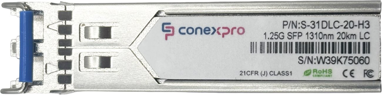 Gigabit Singlemode SFP module from the manufacturer Conexpro with a wavelength (Tx and Rx) of 1310 nm, speed of 1 Gbps, equipped with two LC connectors with UPC polishing and designed for connections at distances up to 20 km. The module is specifically modified to ensure wide compatibility, including full support for HP / H3C / 3Com devices and other brands as per MSA standards. It also supports optical link diagnostics via DDM (Digital Diagnostic Monitoring) functionality.